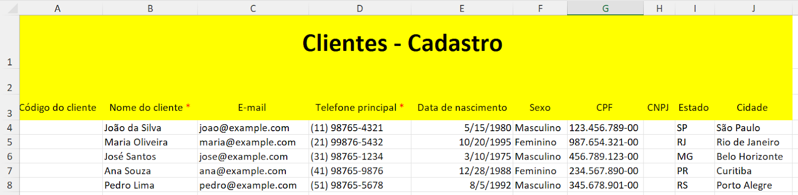 Você pode enviar as informações de novos clientes através de planilhas. Os dados devem seguir um formato específico conforme o formato específico da planilha fornecido: