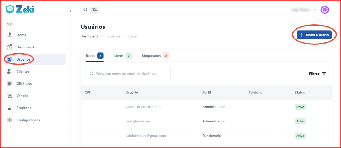 No módulo de Usuários, você irá criar novos registros de usuários de forma simples e intuitiva:
