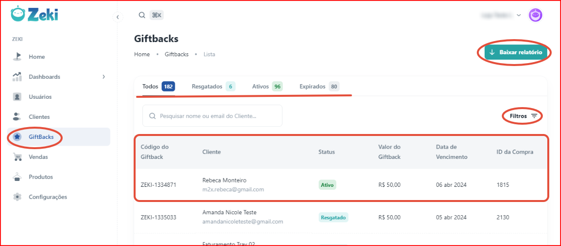 O usuário pode acessar o módulo de Giftback e visualizar todas as informações relacionadas aos Giftbacks cadastrados. Isso inclui detalhes como dados do cliente, data de vencimento, valor e código do Giftback. (Bem como baixar relatórios)