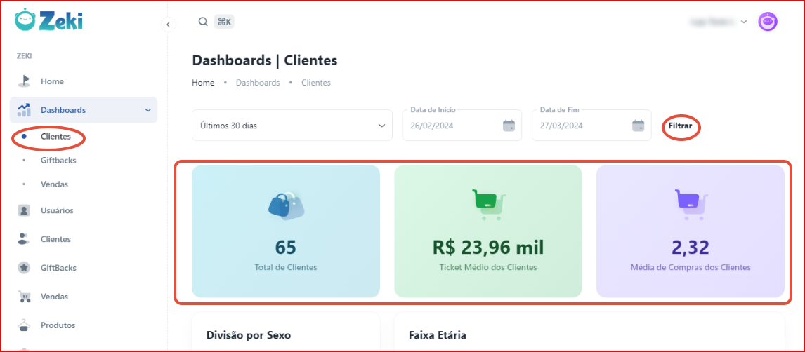 No dashboard de Clientes, o usuário pode utilizar um filtro que contém o Período pré-definido, Data do Início e Data do Fim, para filtrar clientes daquele período específico.
