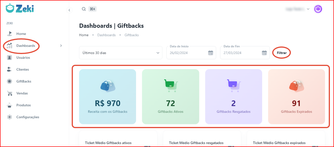No dashboard de Giftbacks, o usuário pode ver o valor do Ticket Médio de Giftbacks gerados e o Ticket Médio dos Giftbacks resgatados
