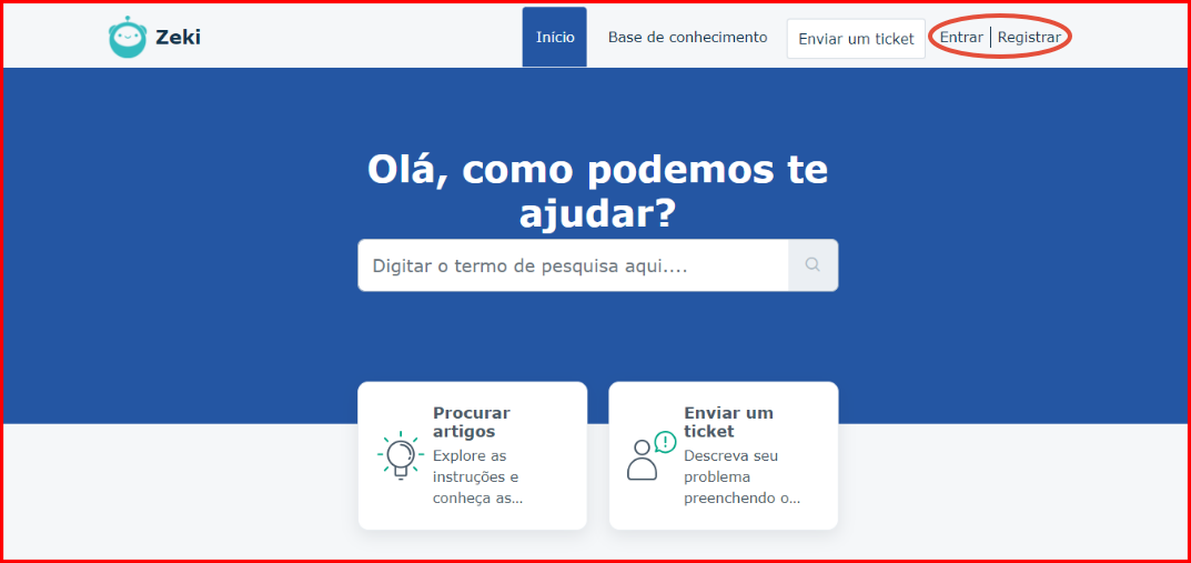Abra seu navegador da web e acesse a URL da Central de ajuda do Zeki: https://zeki.freshdesk.com/support/home e Clicar em “Entrar / Registrar”.