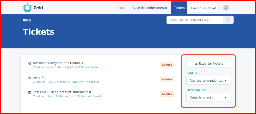 19. Em “Tickets”, você pode: Exportar Tickets, Ver o Status do pedido e Ordenar os Tickets por data de criação.