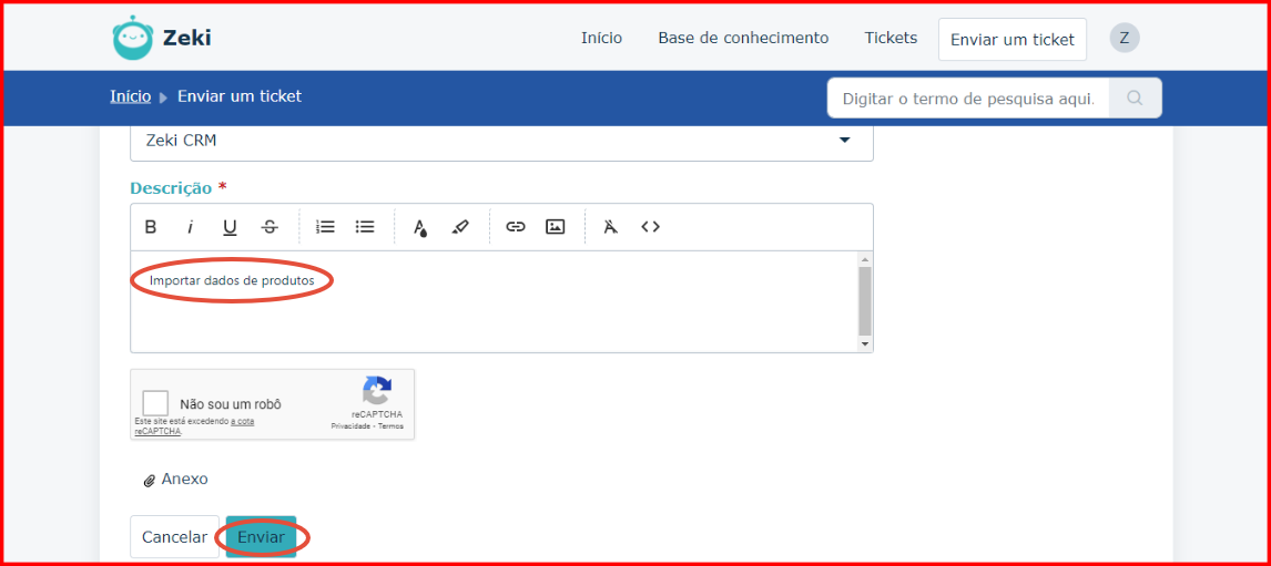 Produto: Selecione "Zeki" como o produto para sua solicitação.