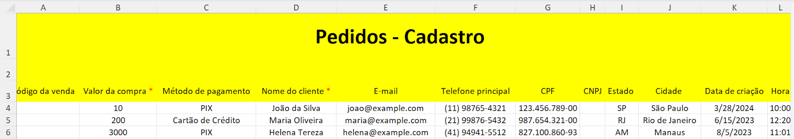Você pode enviar as informações de novos pedidos através de planilhas. Os dados devem seguir um formato específico conforme o formato específico da planilha fornecido: