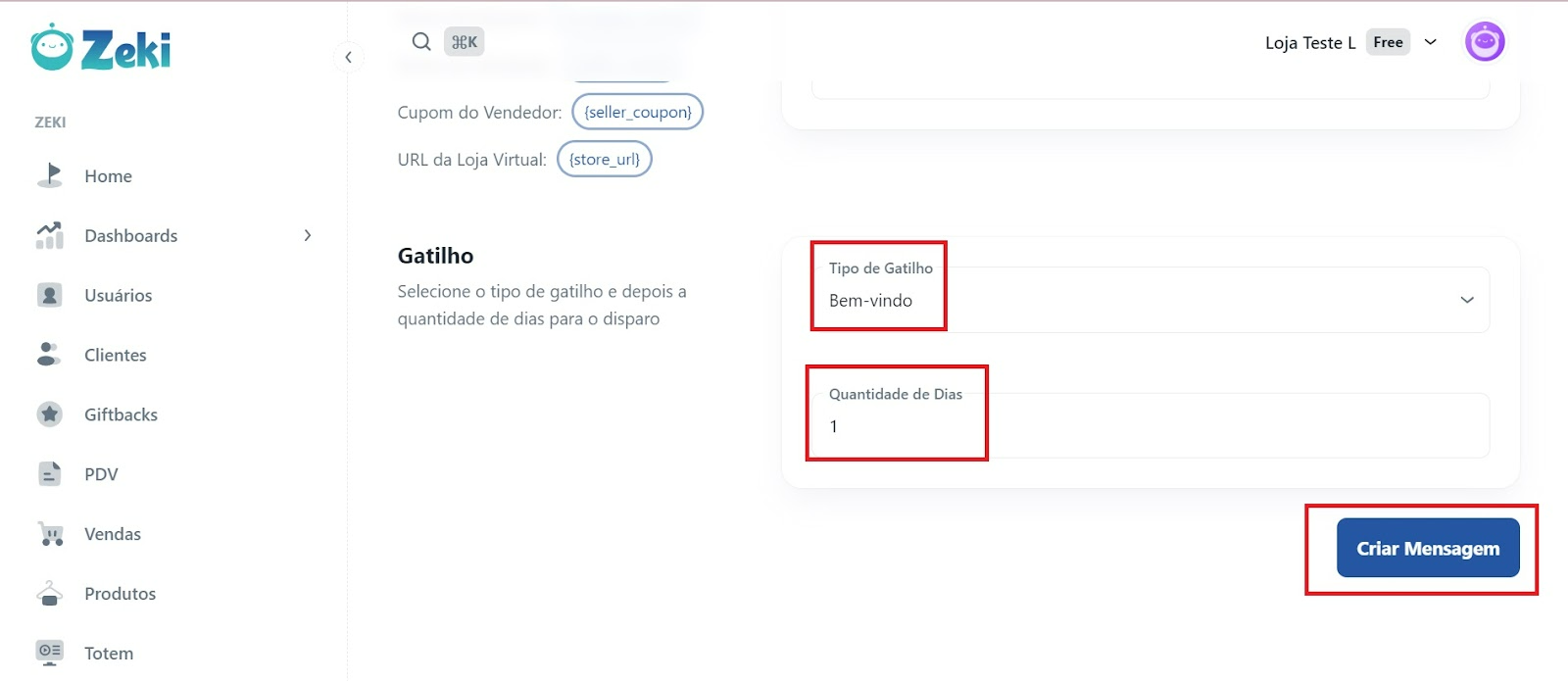 Preencha o conteúdo da mensagem, com a definição dos canais de envio para essa mensagem, as Variáveis, Título, Mensagem, Gatilhos, Quantidade de dias e clique em “Criar Mensagem”.