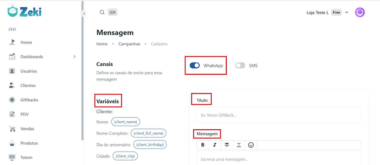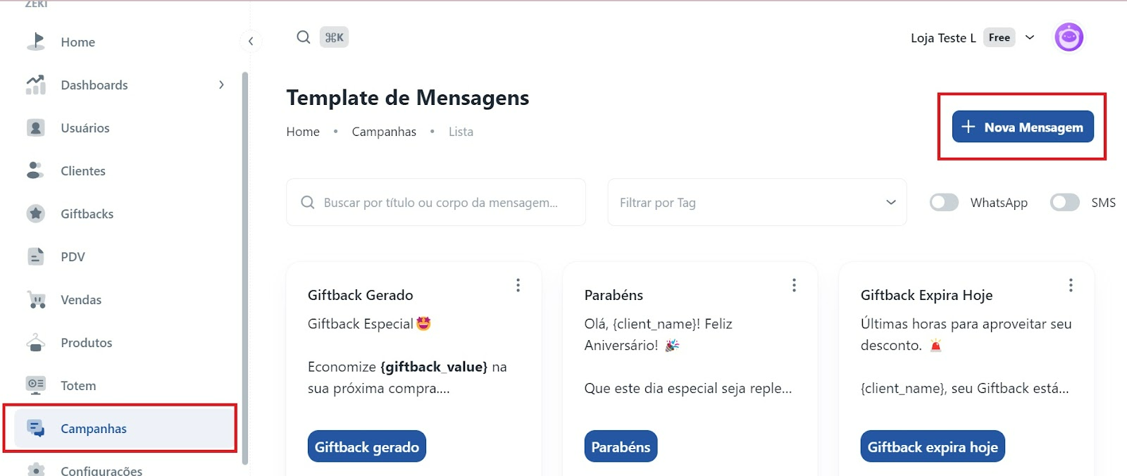 No painel de controle do Zeki, vá até a seção de “Campanhas”. Em seguida, clique em “Criar nova mensagem".